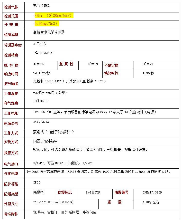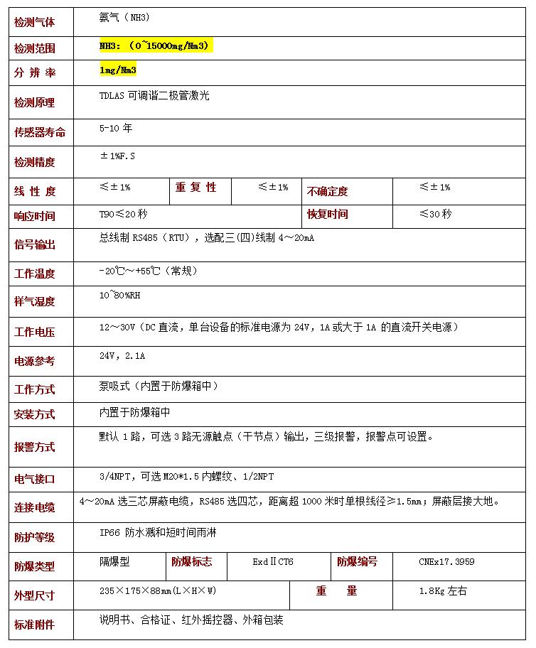 內(nèi)置激光氨氣檢測(cè)儀技術(shù)參數(shù)
